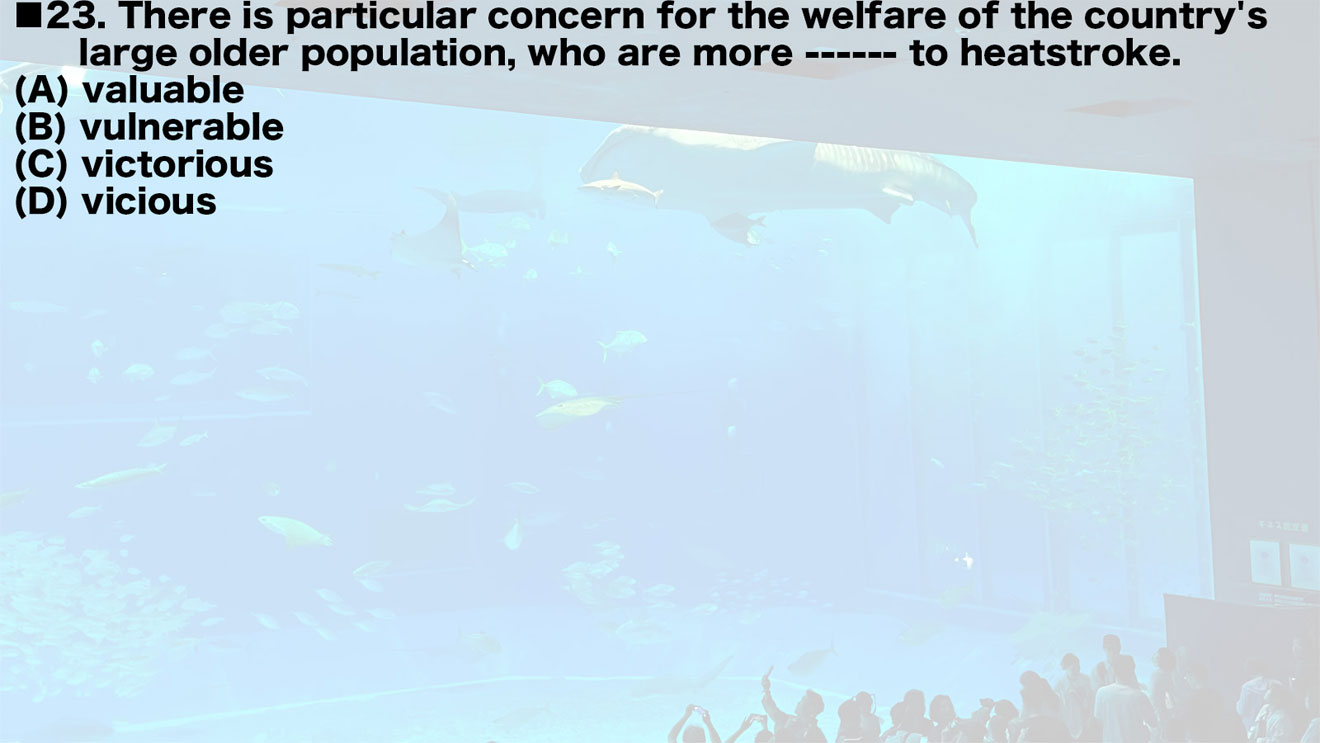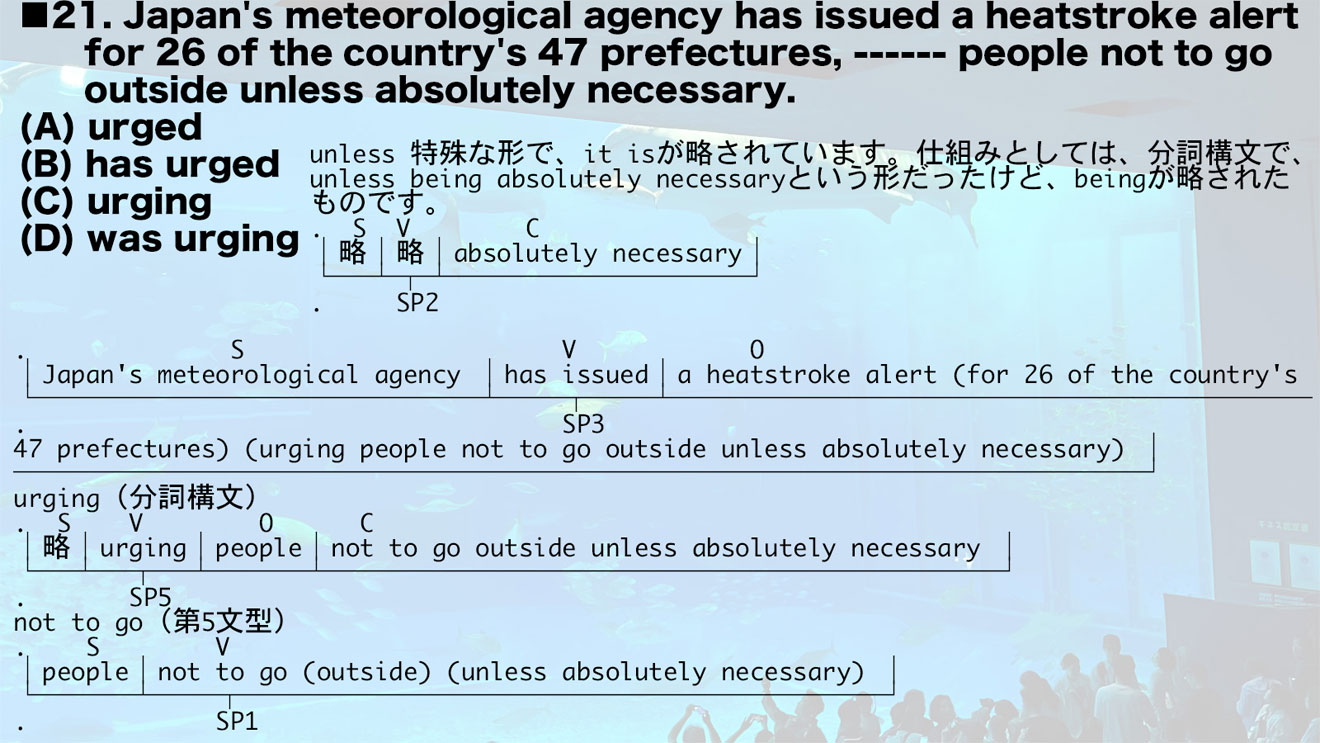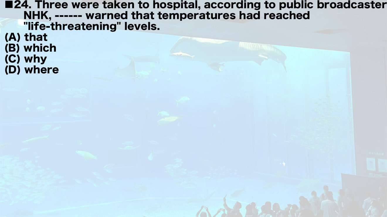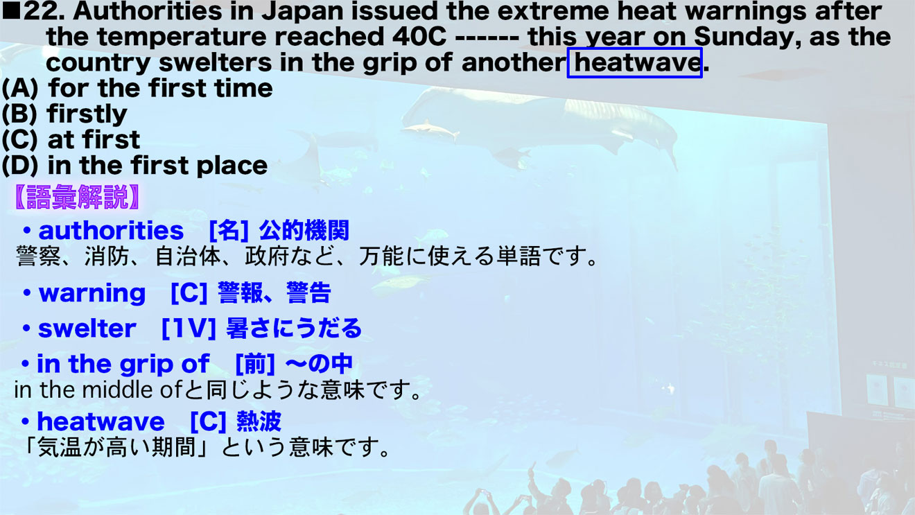 普段の日常生活に使うものばかり。例えば、↓の問題って、すべて日本の猛暑の熱中症のニュースで使われた英文(イギリスメディアが日本の状況を報じたものです)。