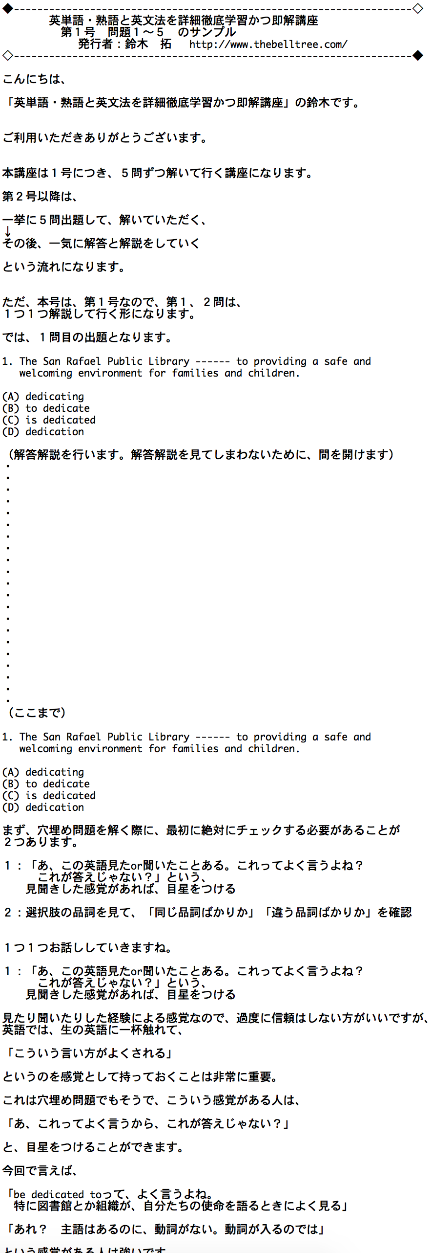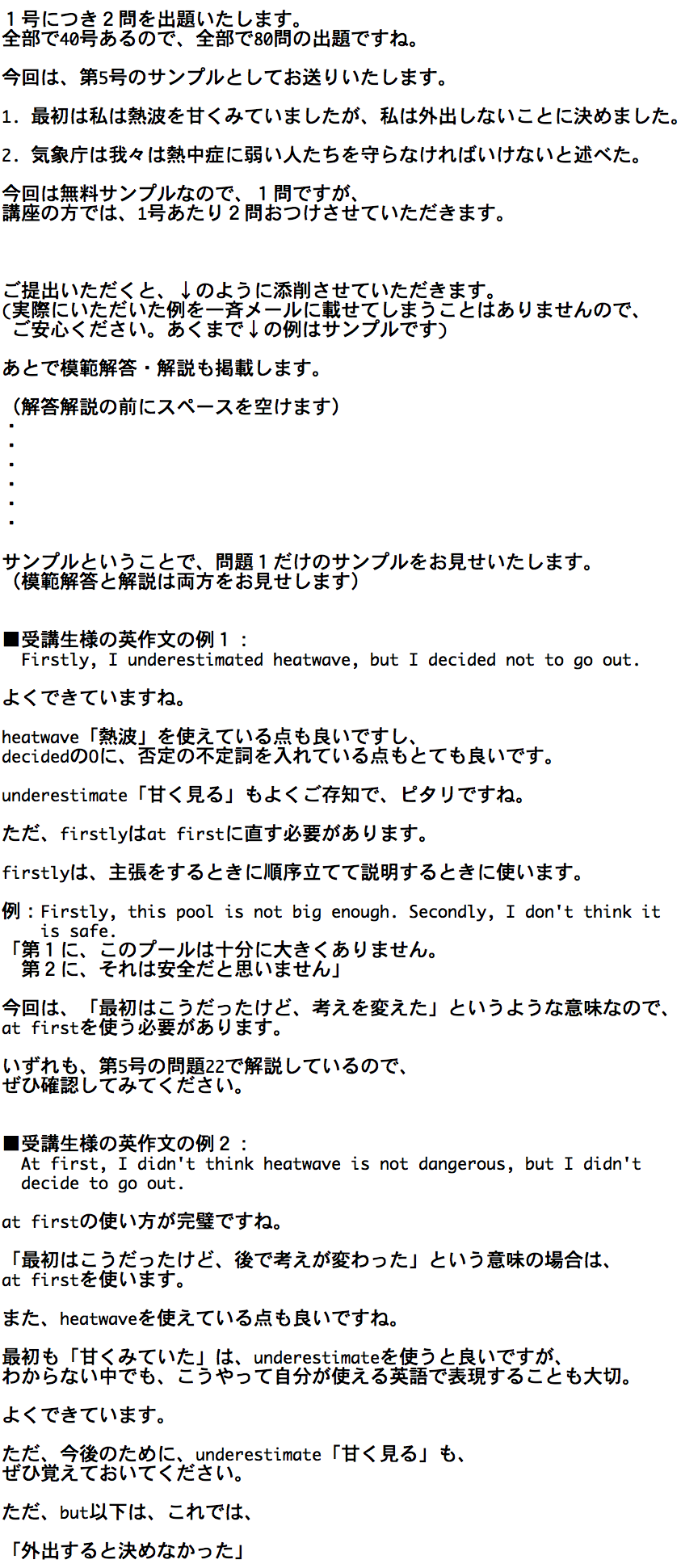 3:後で説明しますが、↑の英単語・熟語、英文法のポイントを使った英作文問題も出題。ご提出いただけば、添削させていただきます。模範解答と解説でセルフ学習も可能です